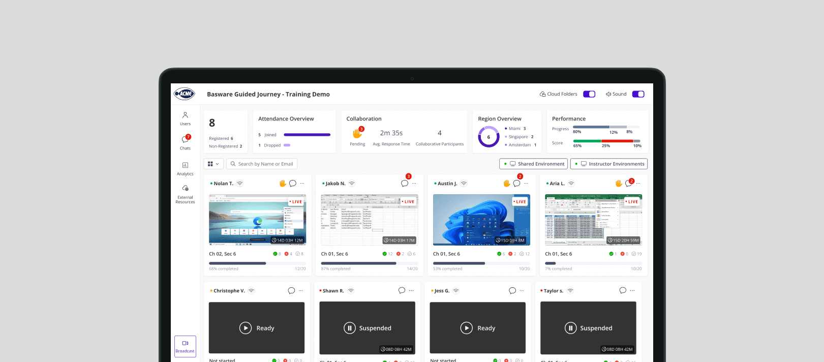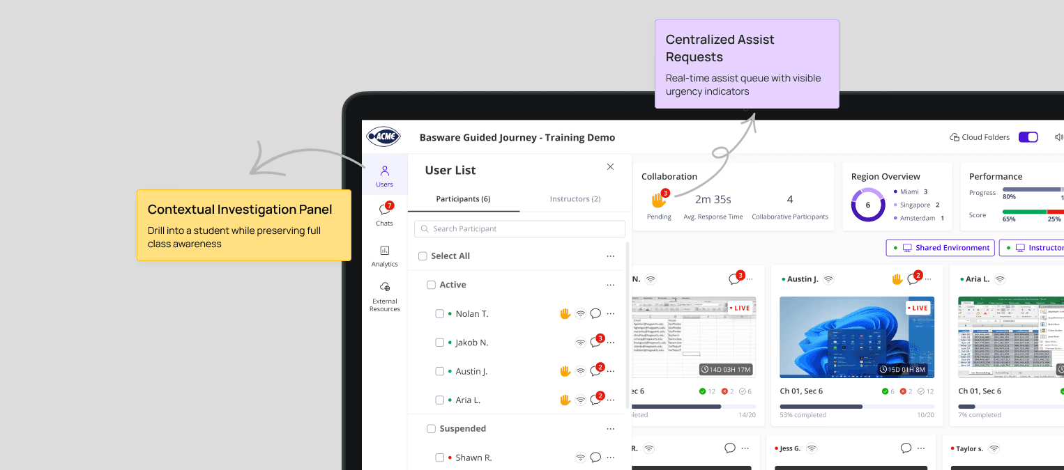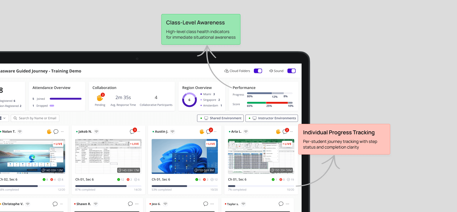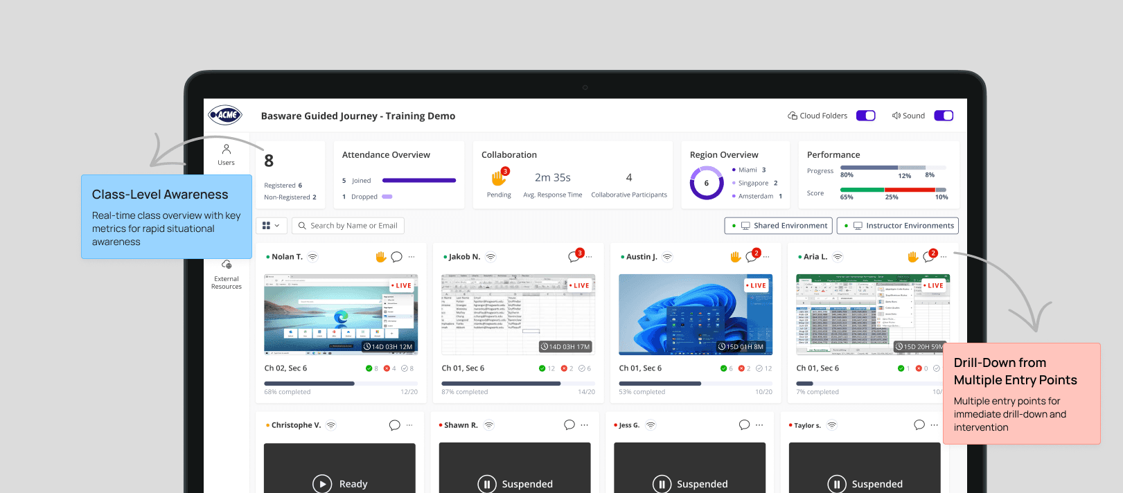 Class vs. individual visibility Instructors require macro visibility and instant drill-down.